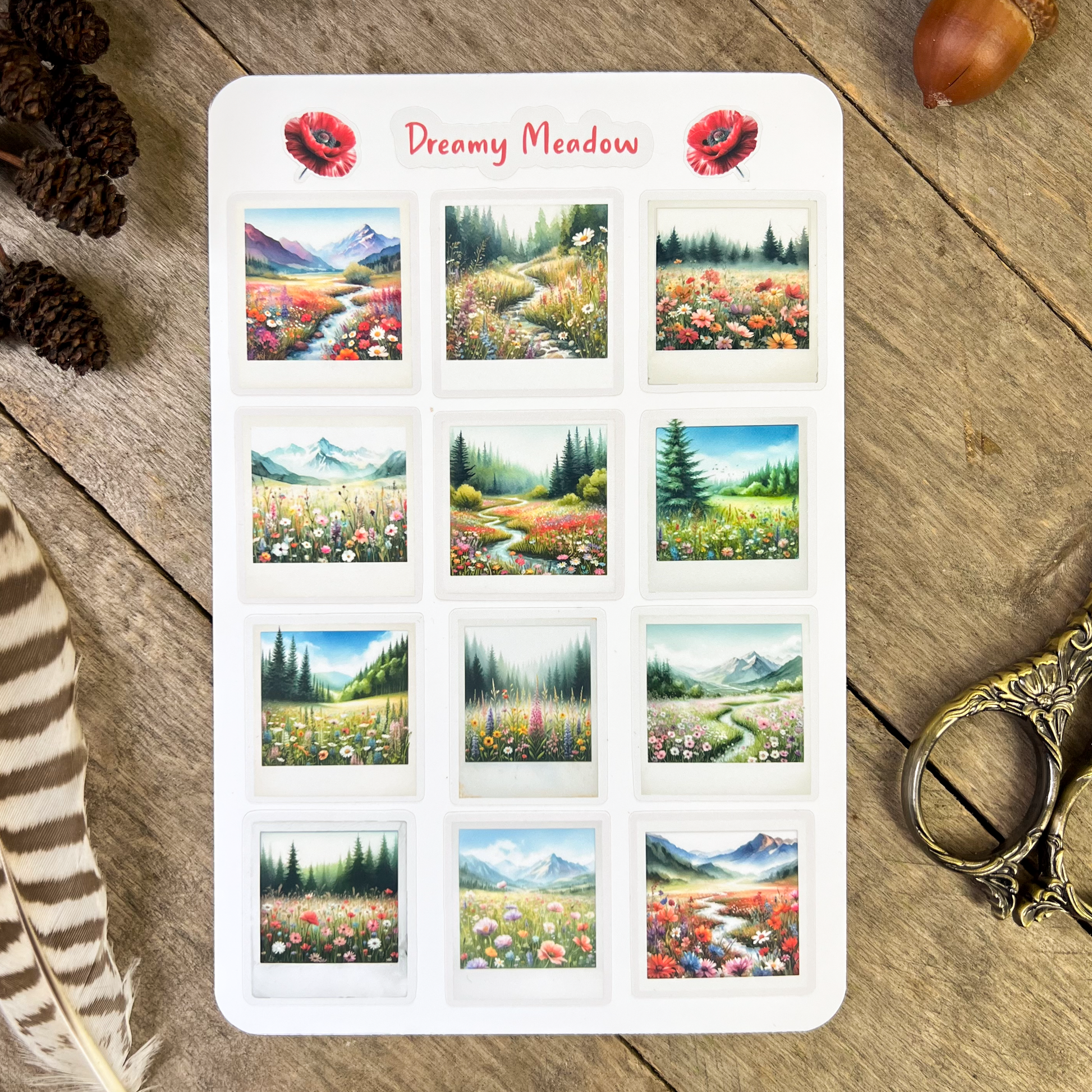 Sticker sheet is A6 size (10x15 cm / 4x6 inches) and contains 12 matt vinyl stickers in a form of mini polaroid pictures, 2 poppy flower stickers and 1 sticker with words 'Dreamy Meadow' and will definitely add a touch of spring dreamy freshness to any project you decide to use them in.